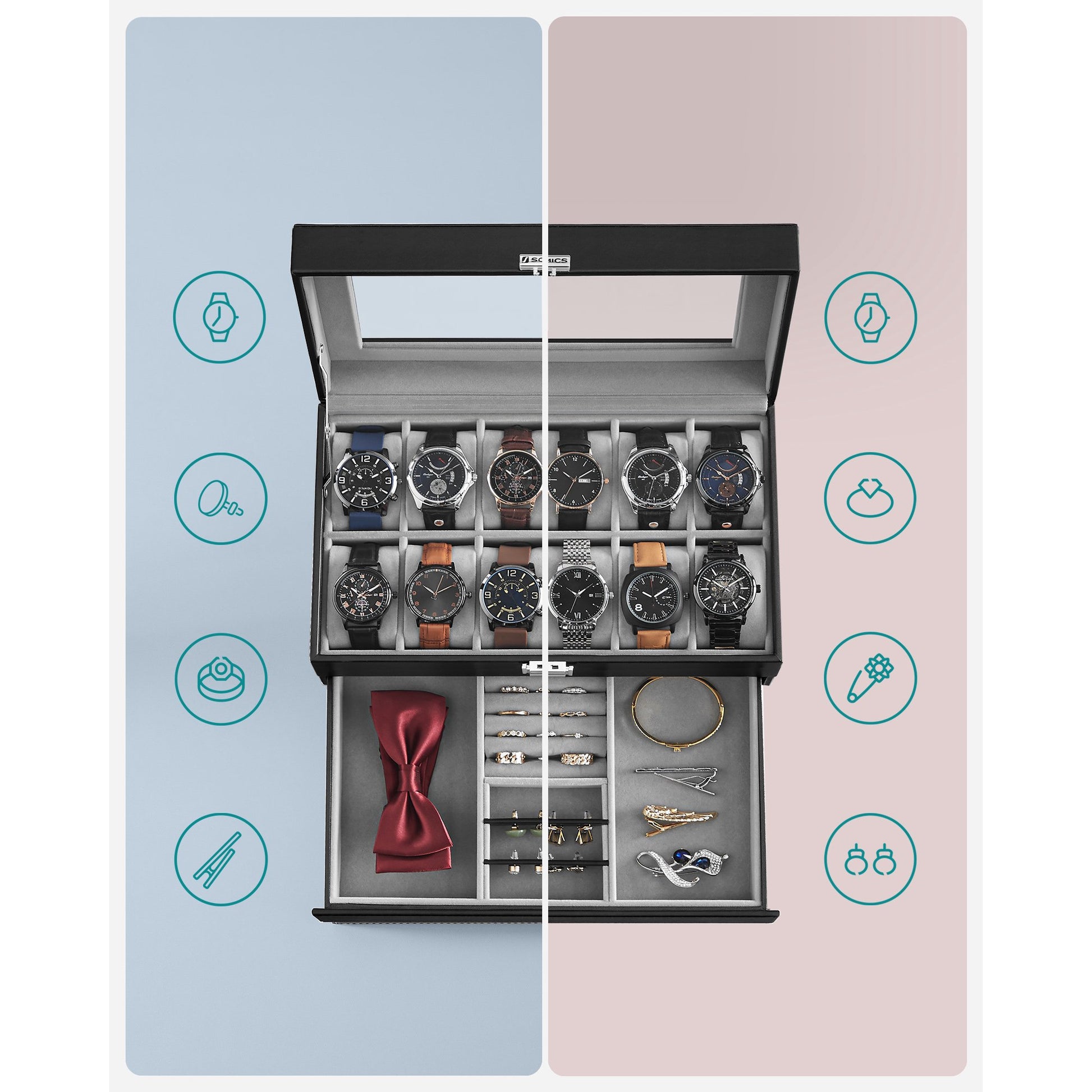 12-Slot Watch Box, 2 Layers Lockable Watch Case with Glass Lid with 1 Drawer, Black and Gray