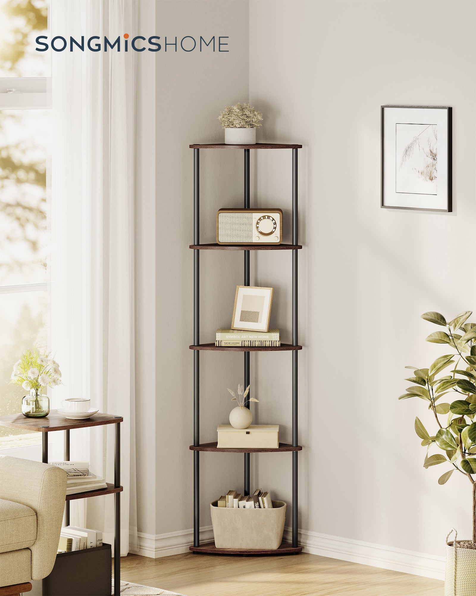 5-Tier Corner Shelf Stand - No Tools Assembly, Space-Saving Storage Unit, 15x10.6x54.7 Inches for Home Organization, Somber Walnut