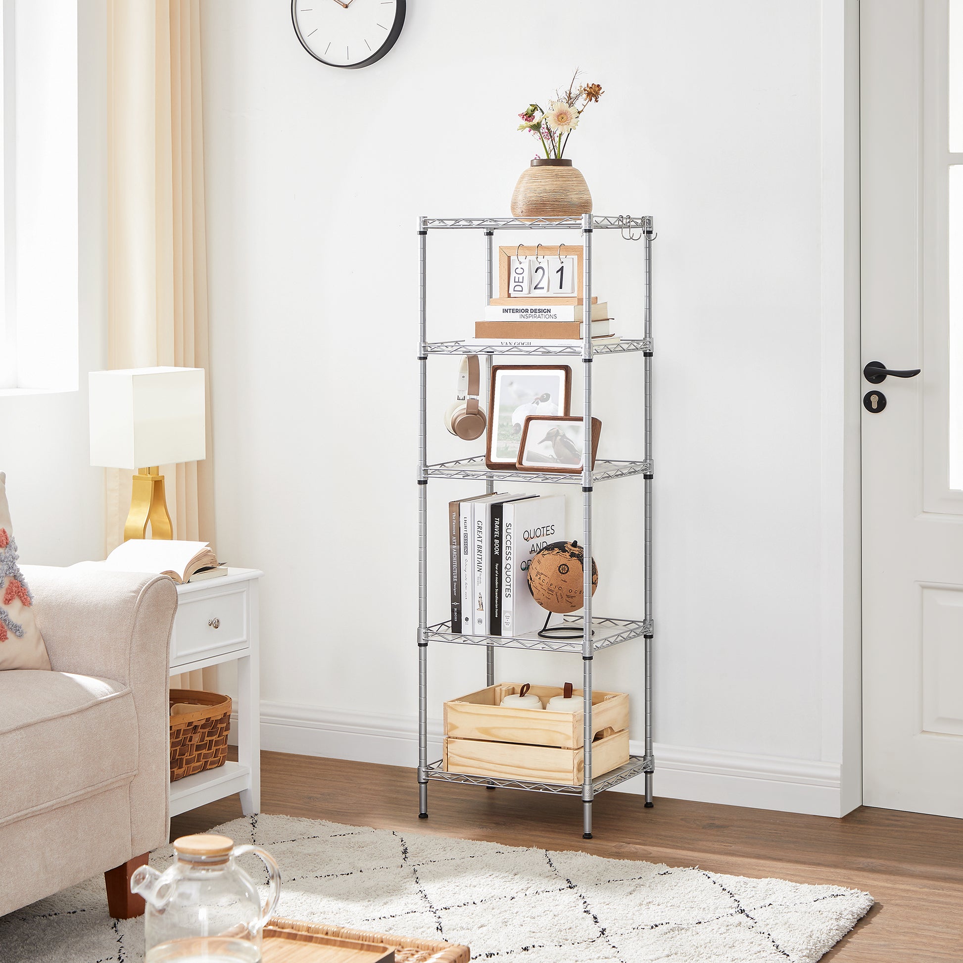 5-Tier Storage Shelves, Wire Shelving Unit, Kitchen Metal Shelves, Storage Rack with Adjustable Shelves, Shelf Liners, 8 Hooks, for Garage, 11.8 x 15.7 x 47.6 Inches, Silver