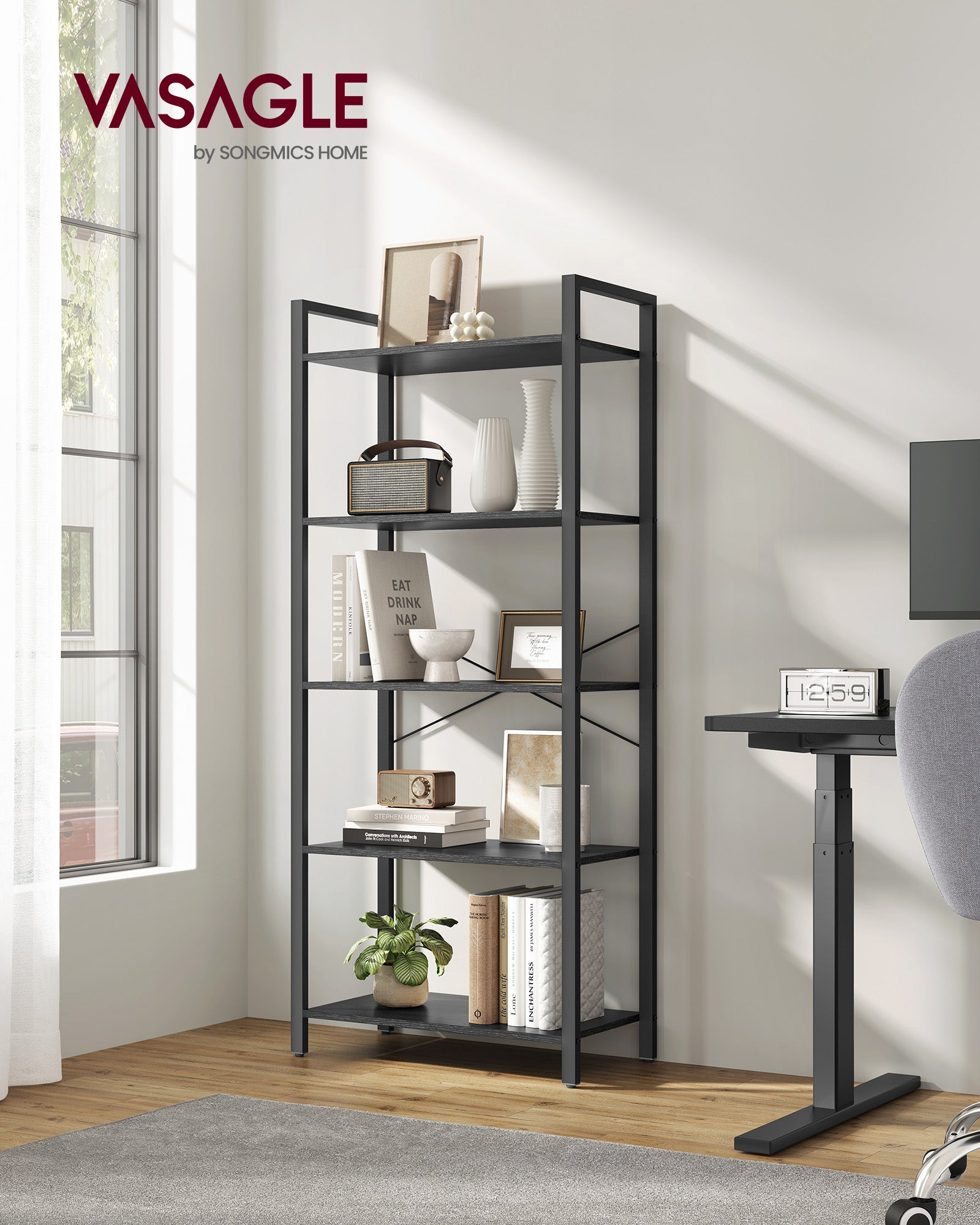 5-Tier Tall Bookshelf, Bookcase with Steel Frame, Book Shelf for Living Room, Home Office, Study, 11.8 x 26 x 60 Inches, Industrial Style