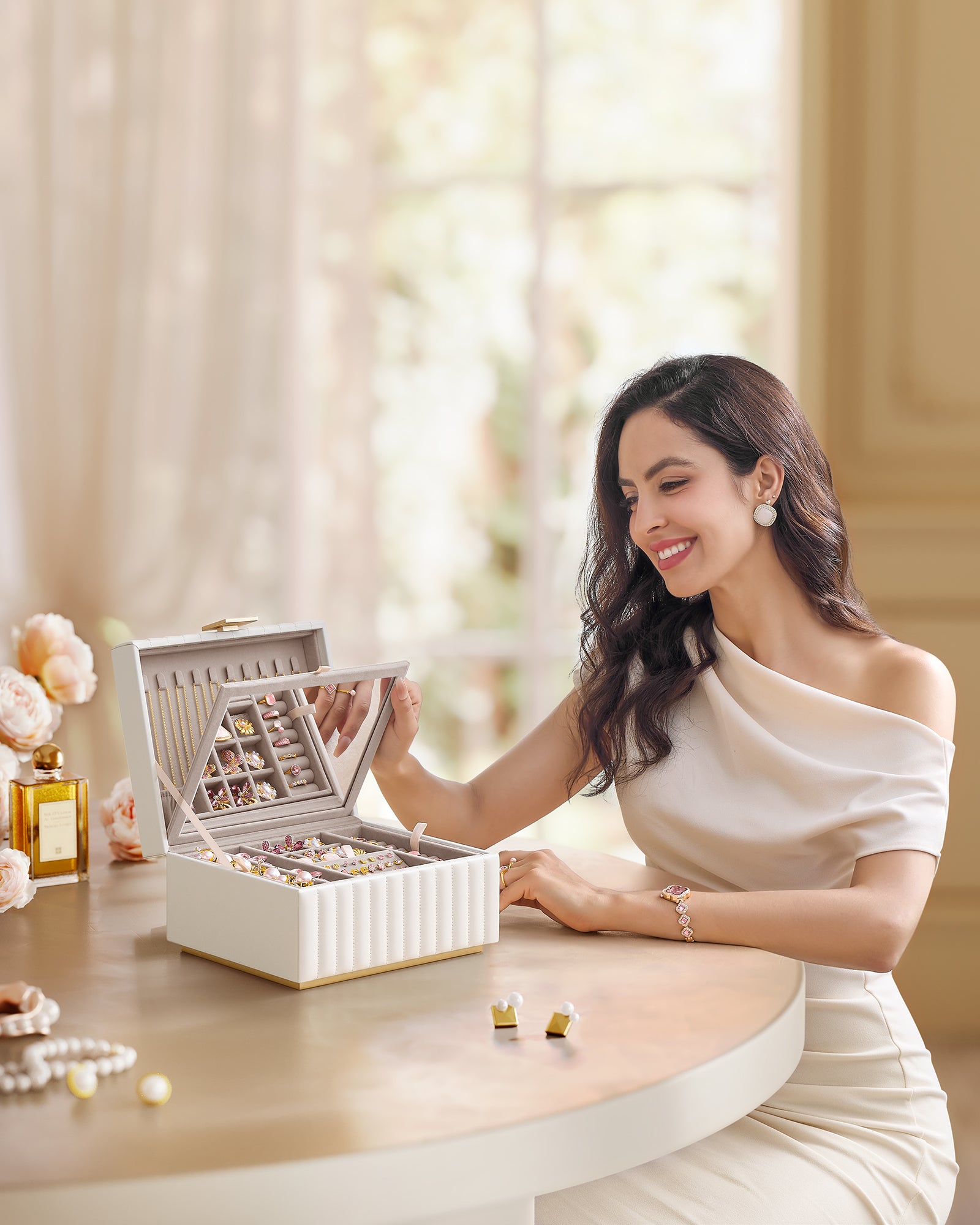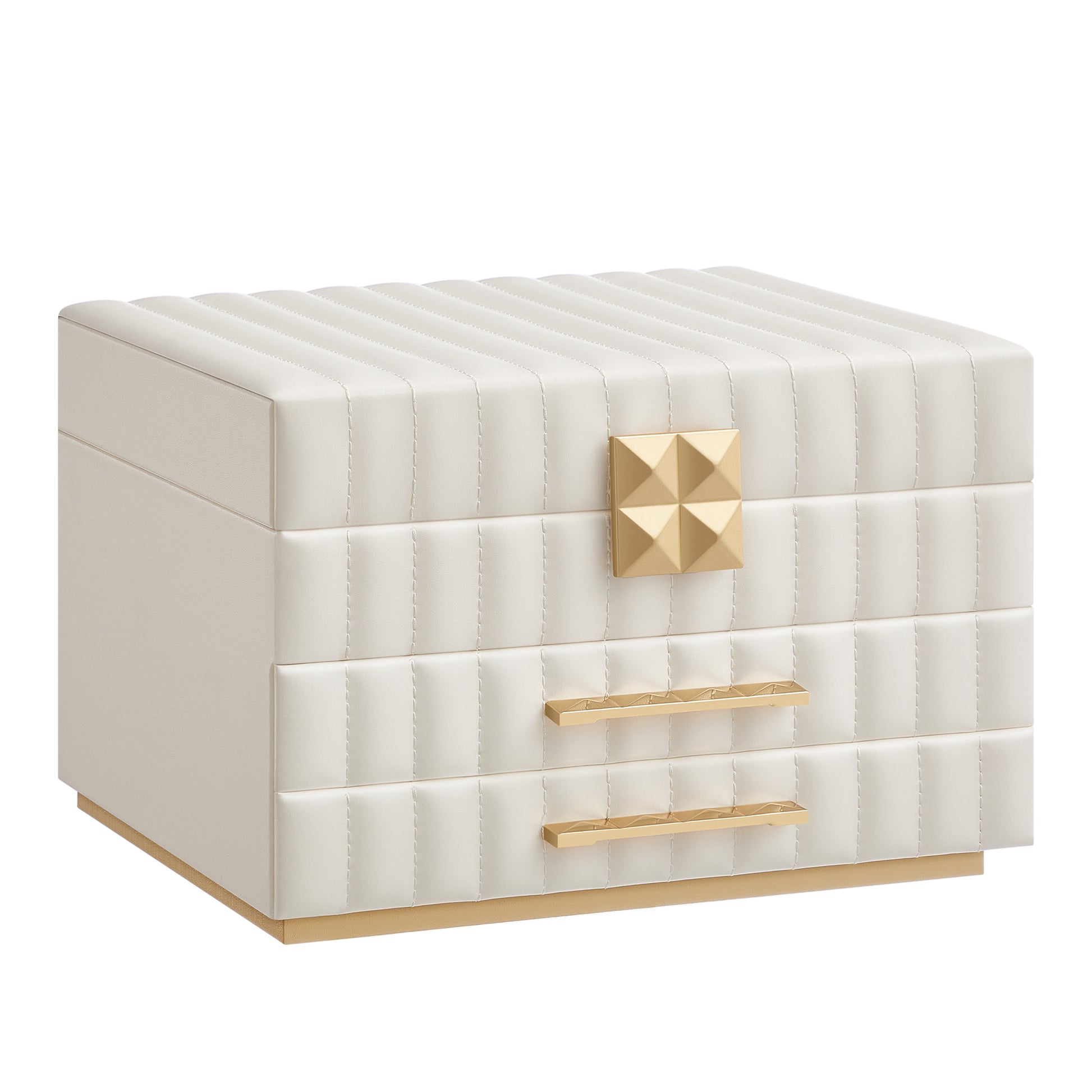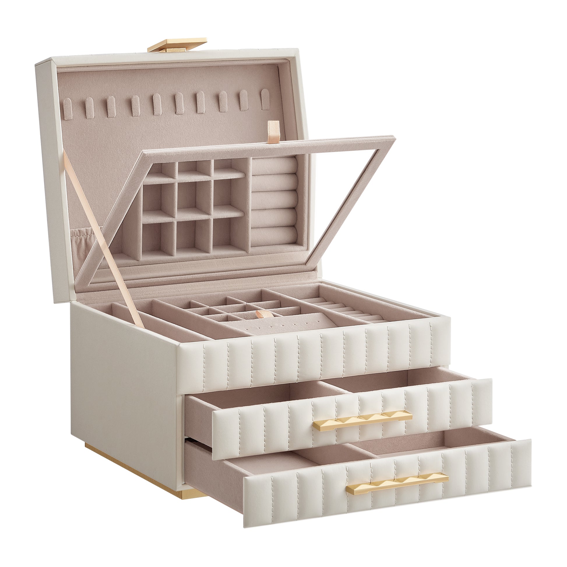 ANAH 3-Tier Jewelry Box with Mirror, Jewelry Organizer with 2 Drawers, PU Surface with Stitching, White