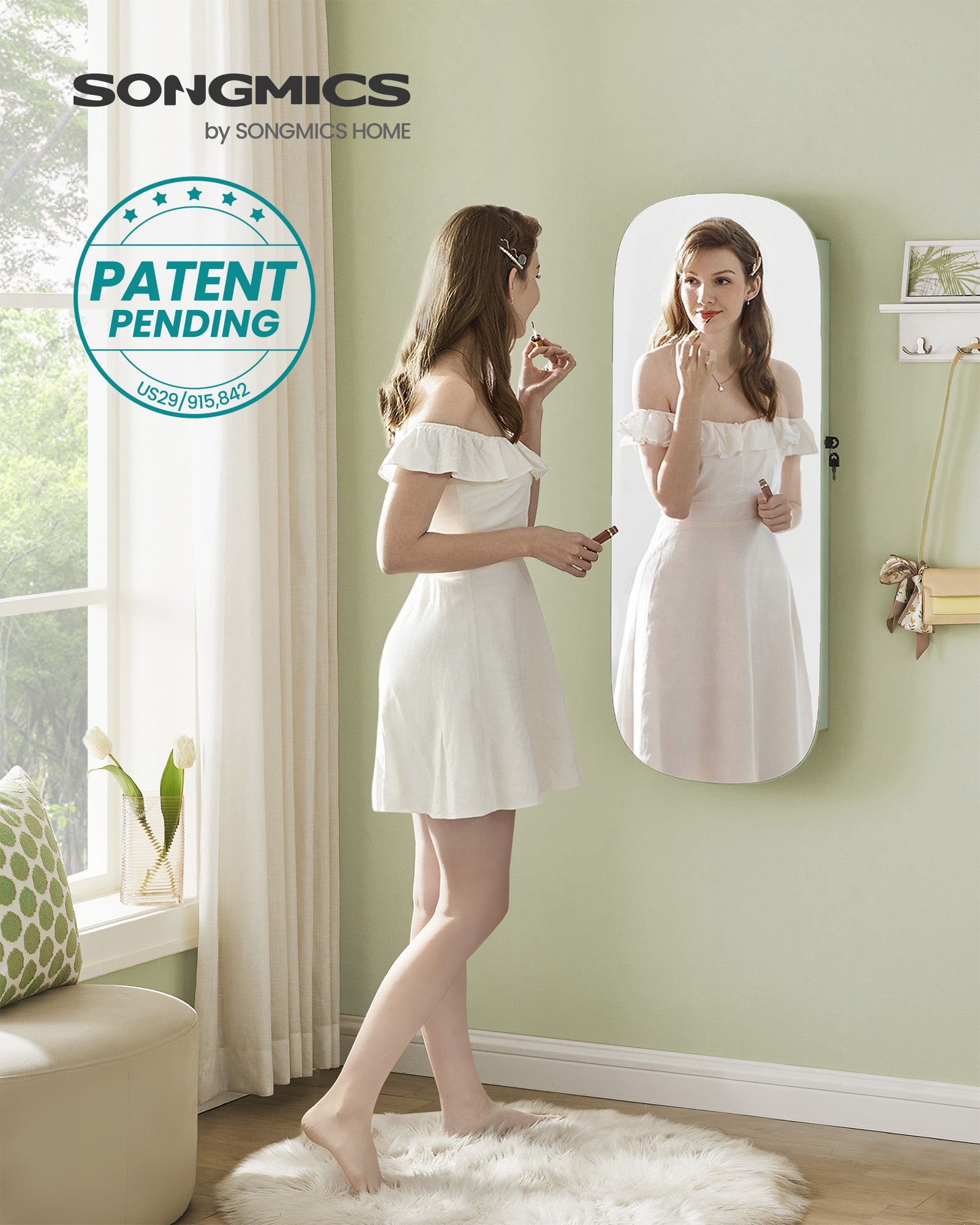 Armoire Jewelry Cabinet, Hanging Mirror Jewelry Organizer, Lockable Wide Storage for Bedroom, Green