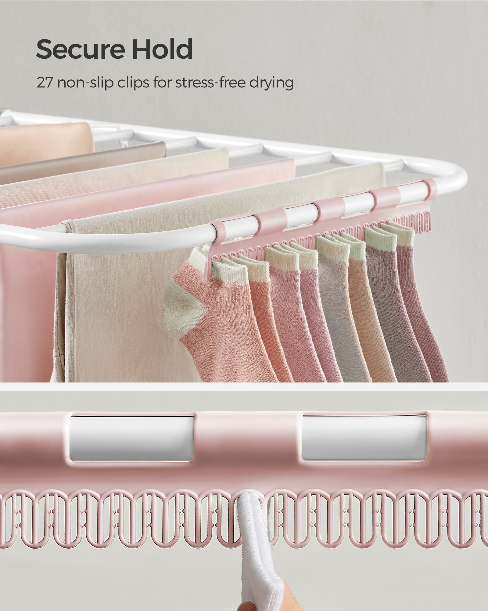Clothes Drying Rack, with Sock Clips, Metal Laundry Rack, Foldable, Space-Saving, Free-Standing Airer, with 2 Height-Adjustable Gullwings, Indoor Outdoor Use, White and Pink