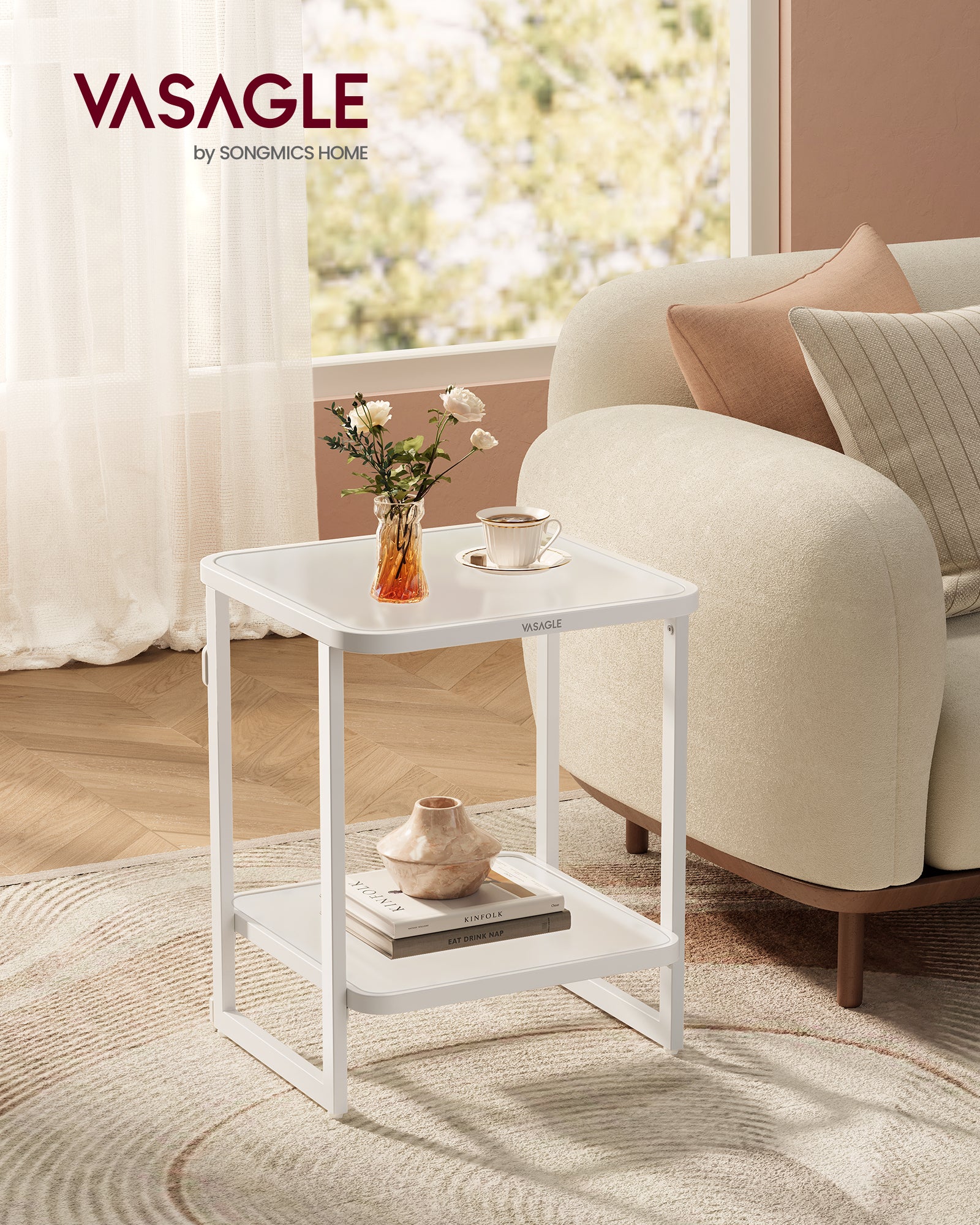 Cloud White & Pearl White End Table - 2 - Tier Side Table with LED Lights. Modern Nightstand with Frosted Glass and Bottom Shelf for Bedroom