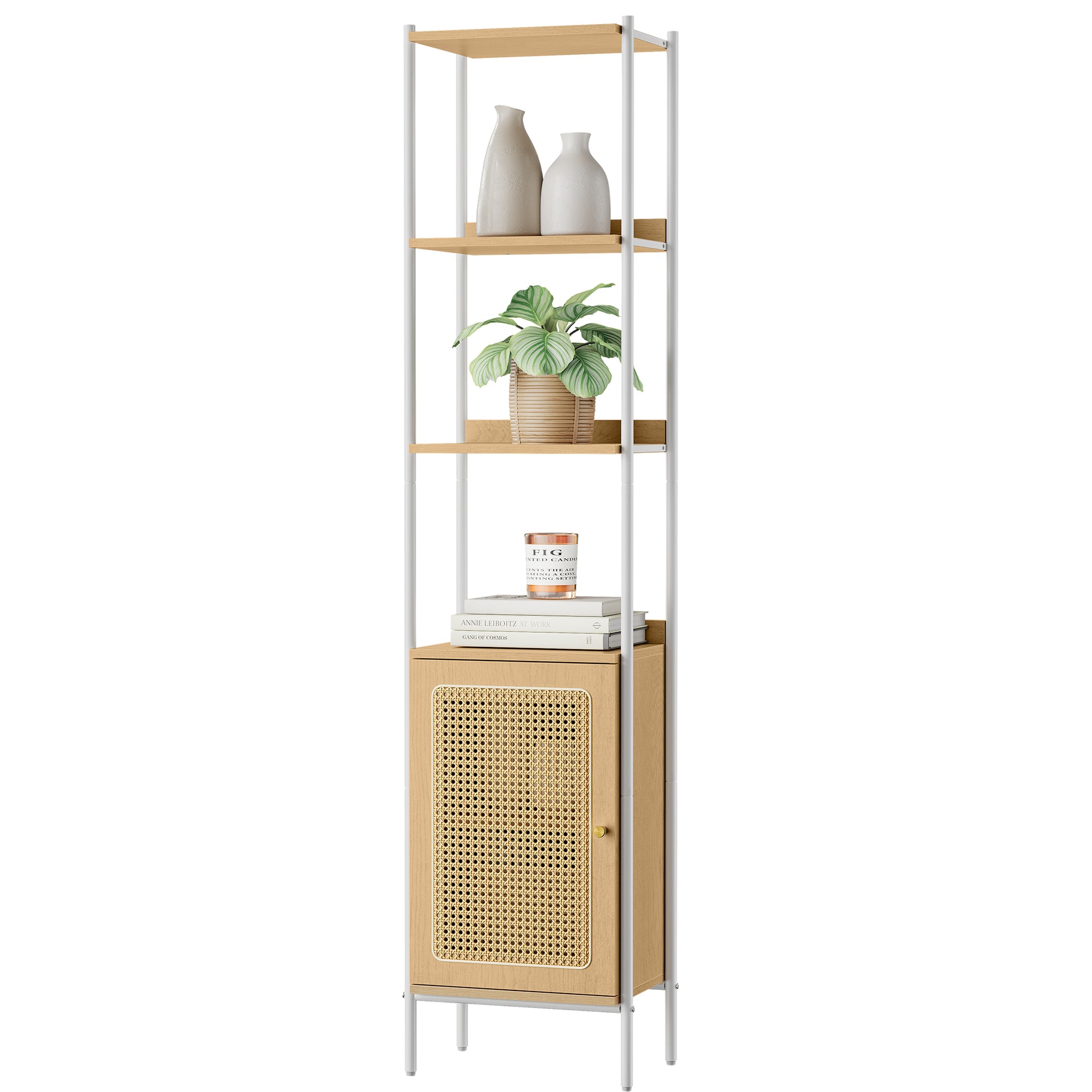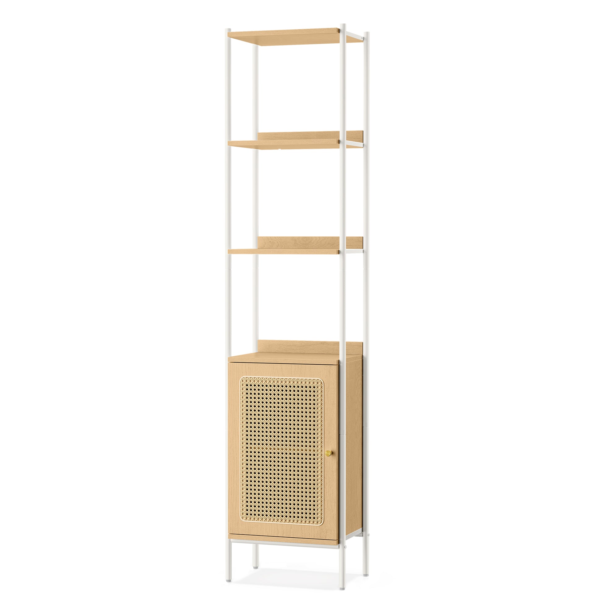- Vertical Storage Efficiency: Standing at 68.8 inches tall, this Freestanding Storage Shelf maximizes vertical storage space with its slim 15.7-inch width, offering a blend of open and concealed storage options to keep your home organized and stylish.