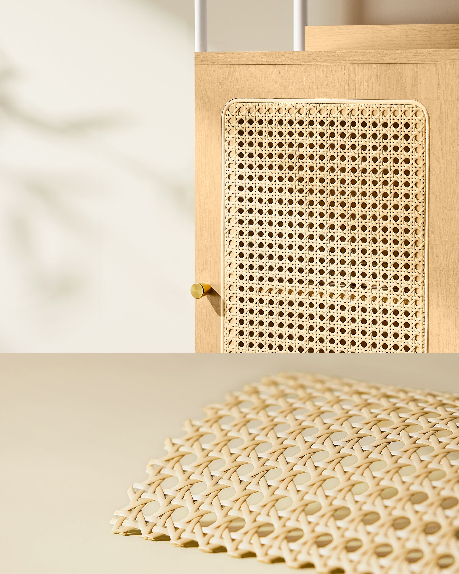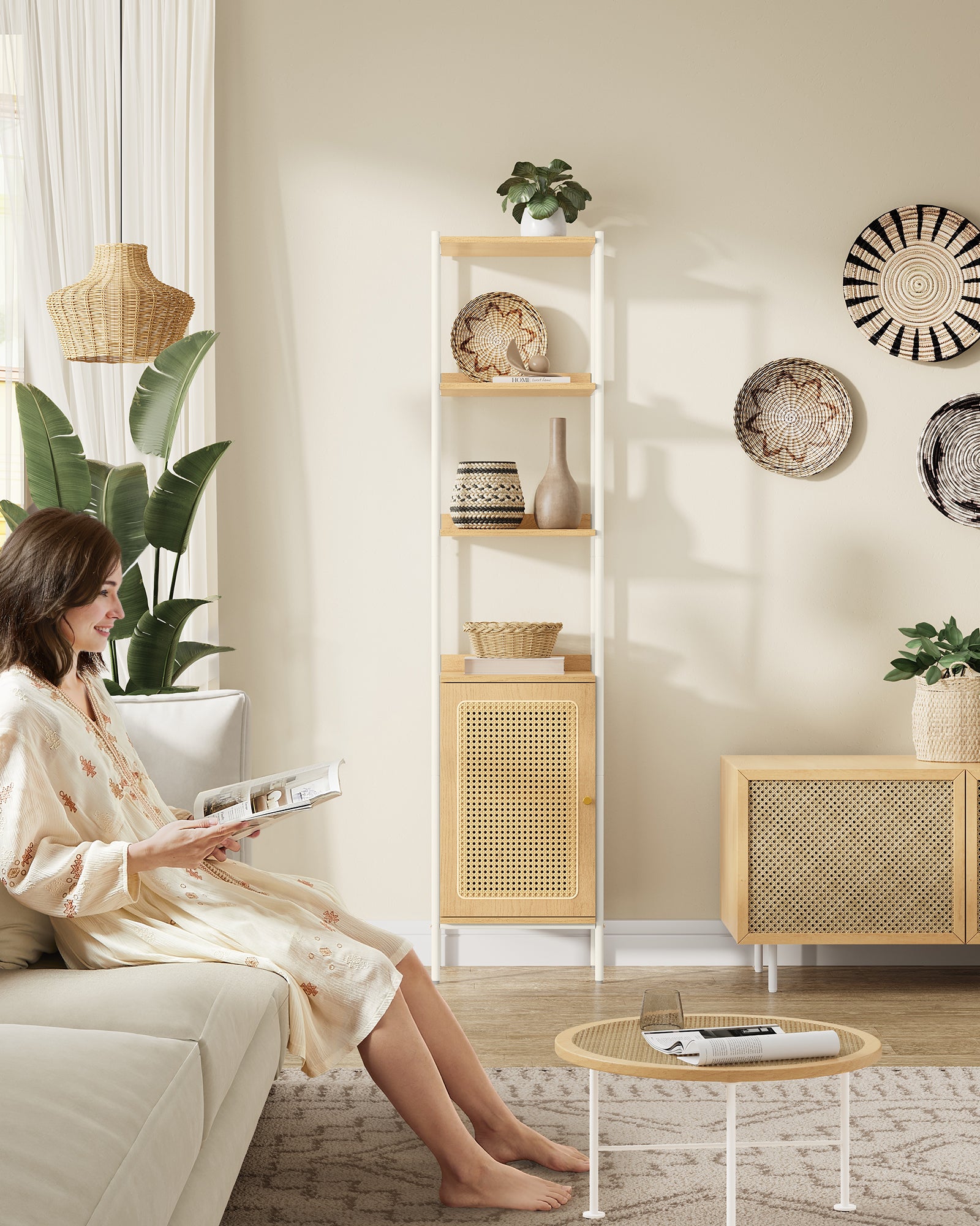- Boho Chic Design: Elevate your space with this Bookshelf featuring a rattan-like door and a calming black palette, adding a touch of bohemian charm to your decor, perfect for modern or boho-inspired living rooms.