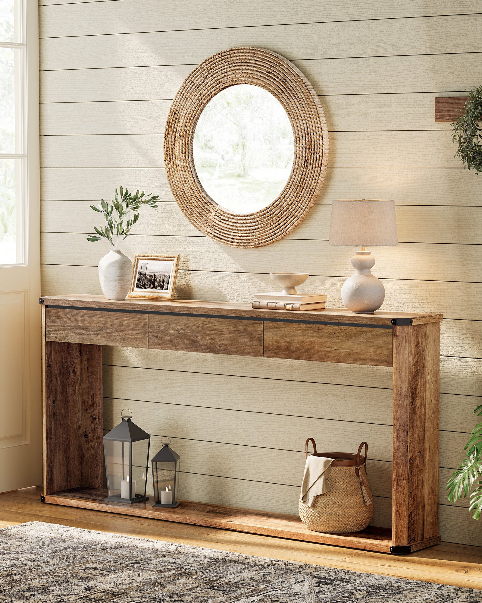 Console Table, 63 Inches Sofa Table, Narrow Entryway Table, Entry Table with 3 Drawers, Bottom Shelf, Metal Corners, for Living Room, Bedroom, Farmhouse Style, Honey Brown