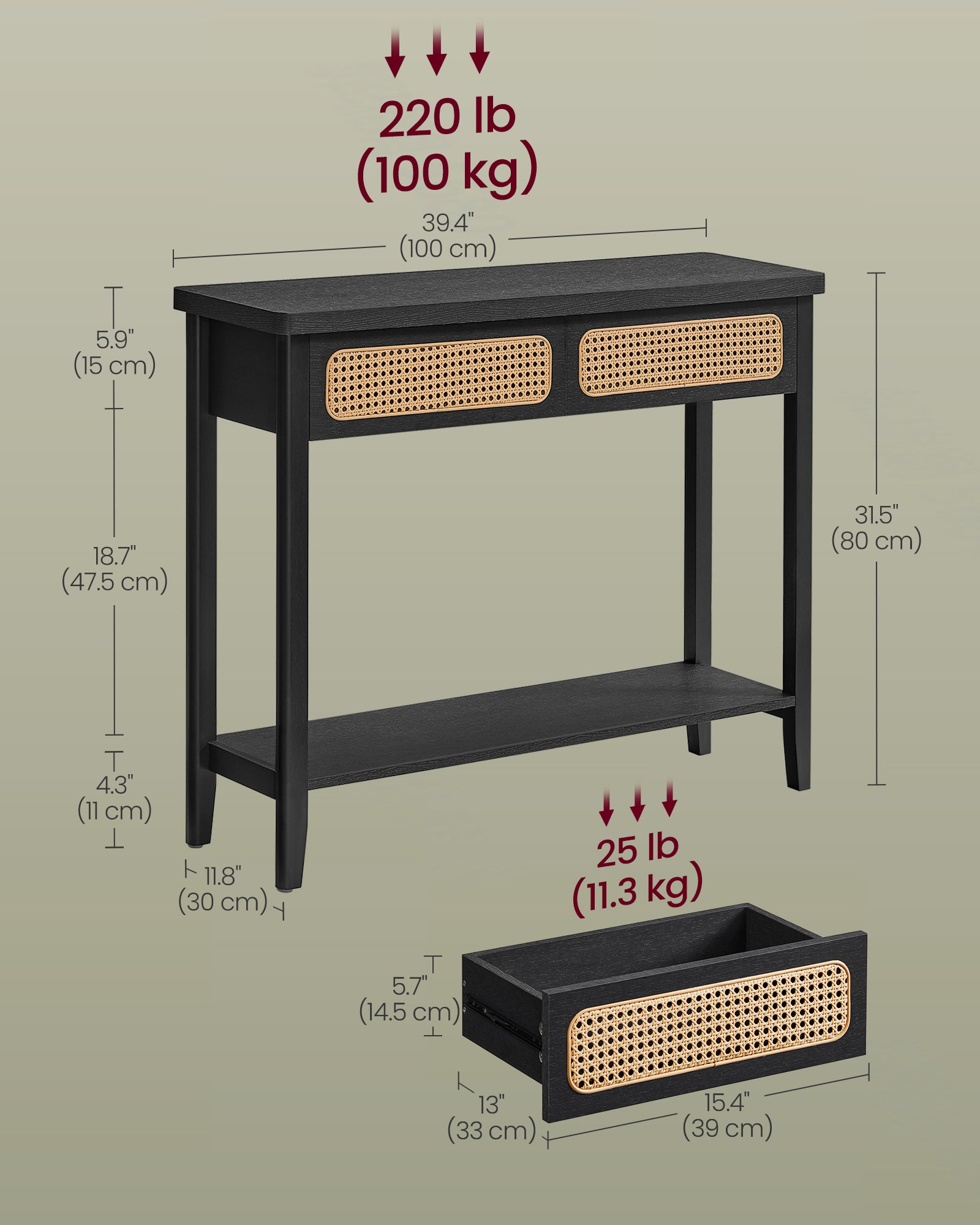 Console Table, Sofa Table, Narrow Entryway Table with 2 Drawers, Open Storage Shelf, Rounded Corners, for Living Room, Boho Style, Ash Black