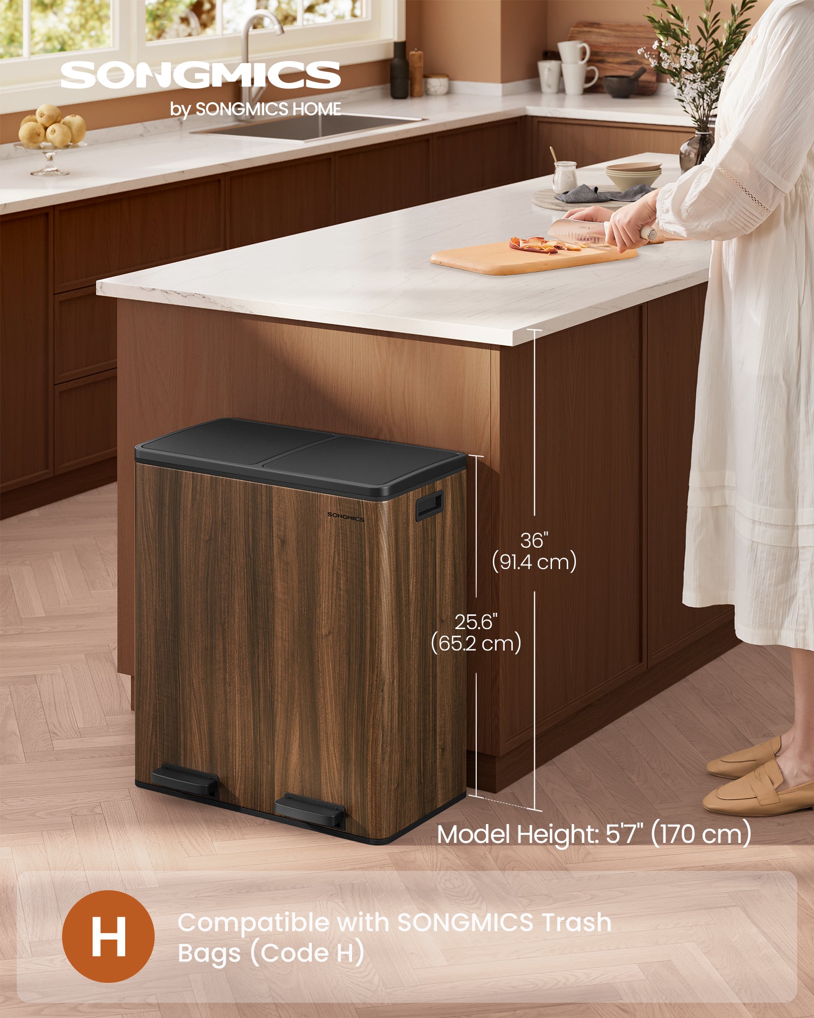 Dual Compartment Trash Can - 2x8 Gallon Kitchen Garbage Bin with Pedal, Removable Buckets & 15 Bags, Airtight Lid, Dark Walnut
