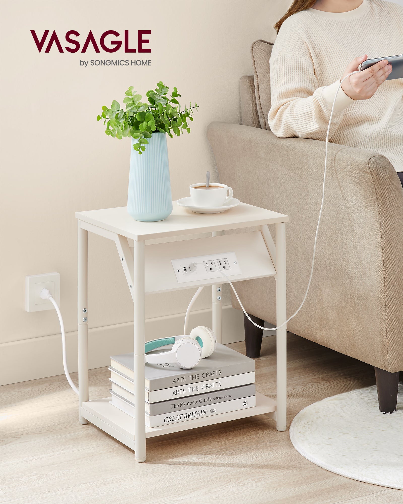 End Table with Charging Station, Set of 2, Small Side Tables for Living Room, Bedroom, Nightstand Bedside Table with Storage Shelf, Cream White