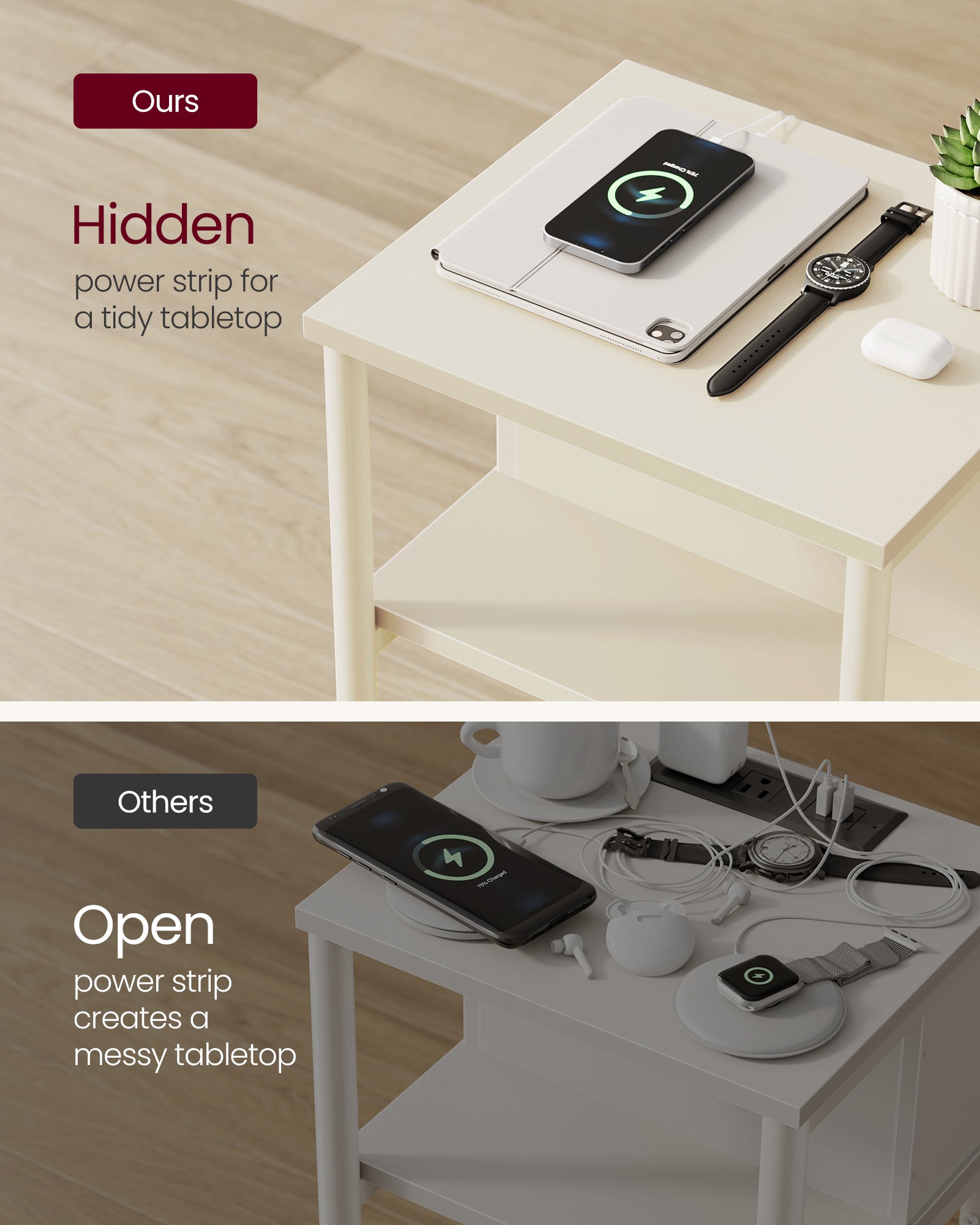 Side Table with Charging Station, 3-Tier End Table with USB Ports and Outlets, Nightstand for Living Room, Bedroom, 11.8 x 13.4 x 22.8 Inches, Plug-in Series, Cream White