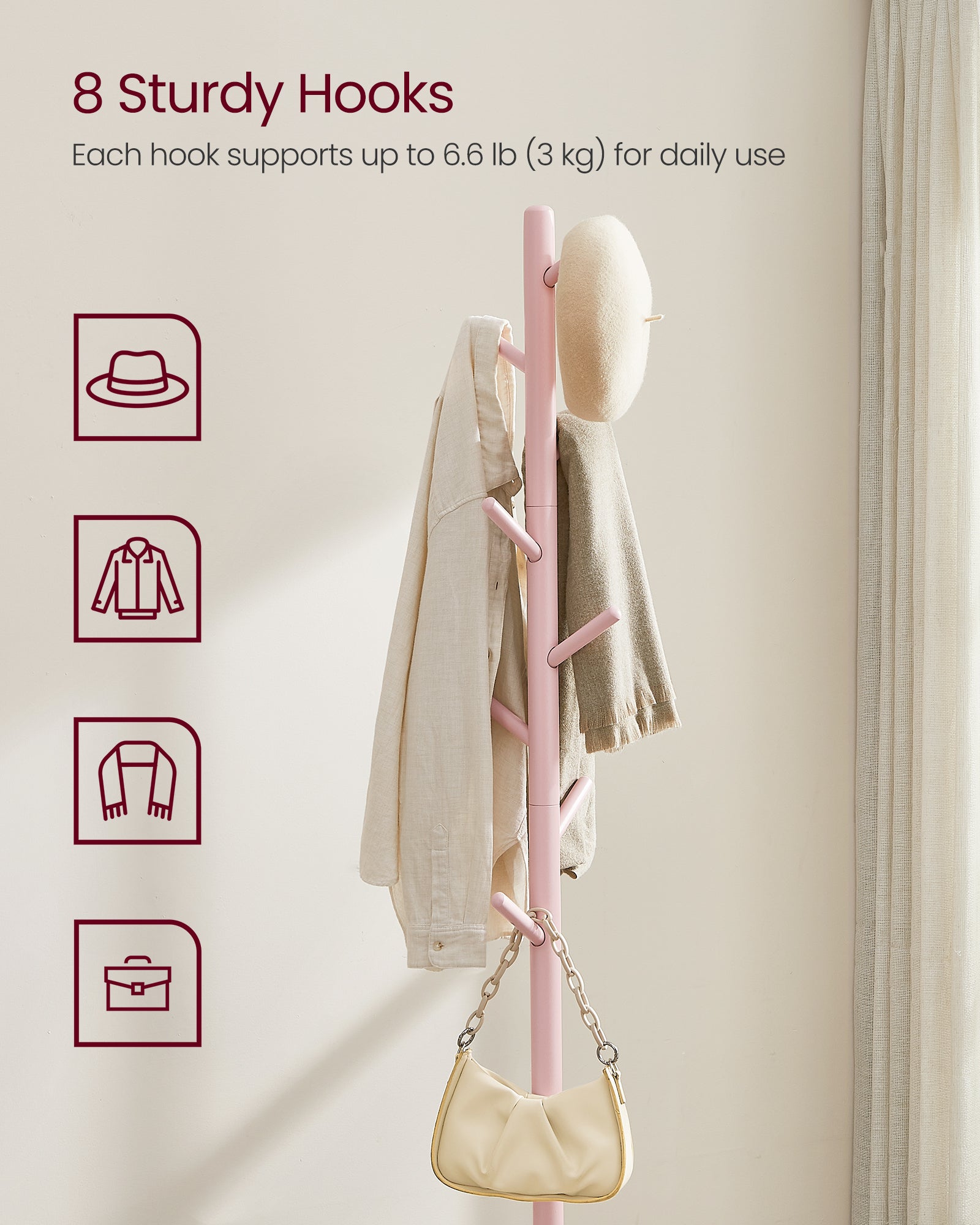 Solid Wood Coat Rack, Free Standing Hall Coat Tree with 8 Hooks, 3 Height Options, for Coats, Hats, Bags, Purses, for Entryway, Hallway, Rubberwood Hooks and Pole, Jelly Pink