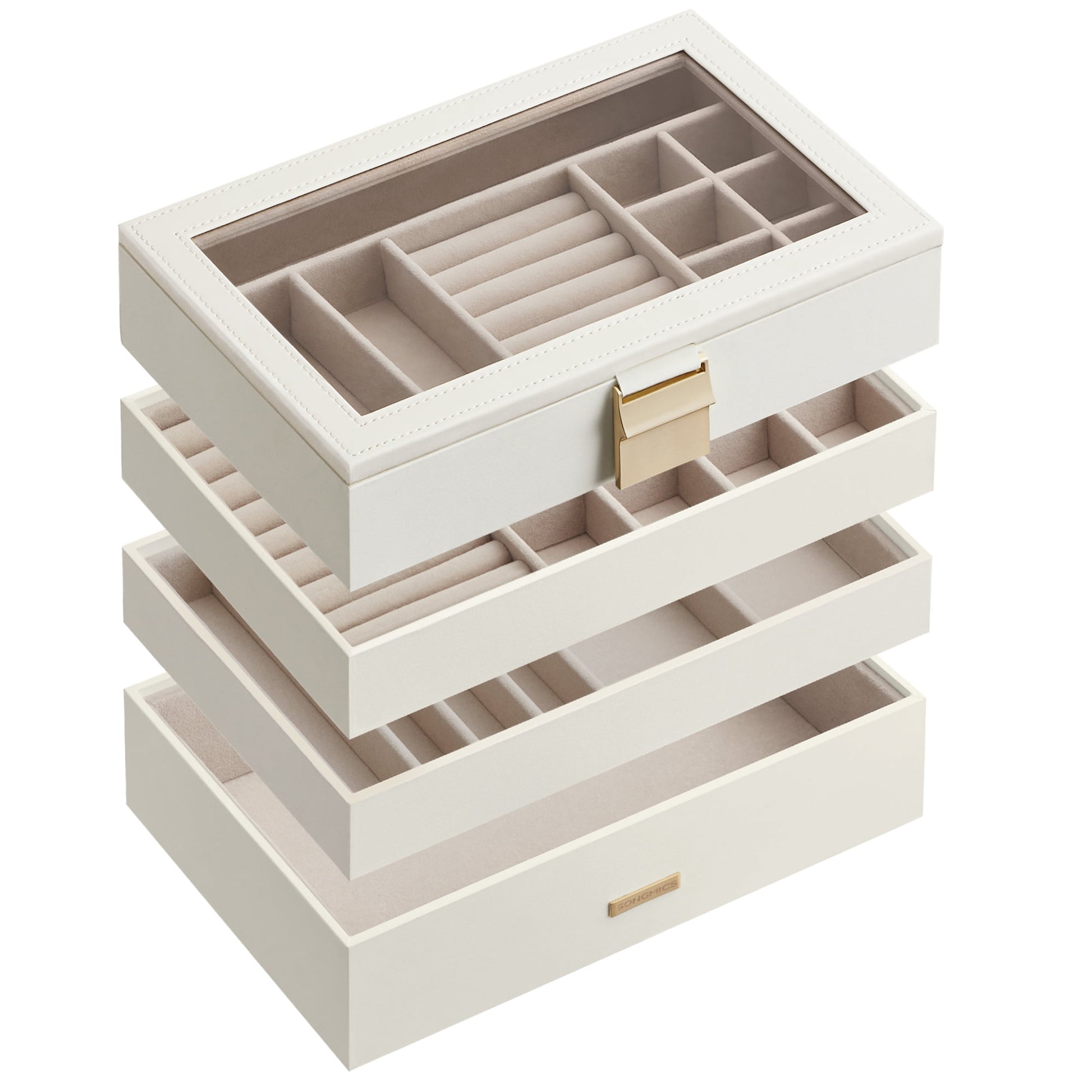 SONGMICS Stackable Jewelry Trays 4-Tier Jewelry Box Drawer Jewelry Organizer with Glass Lid Removable Dividers for Vanity Table Cloud White