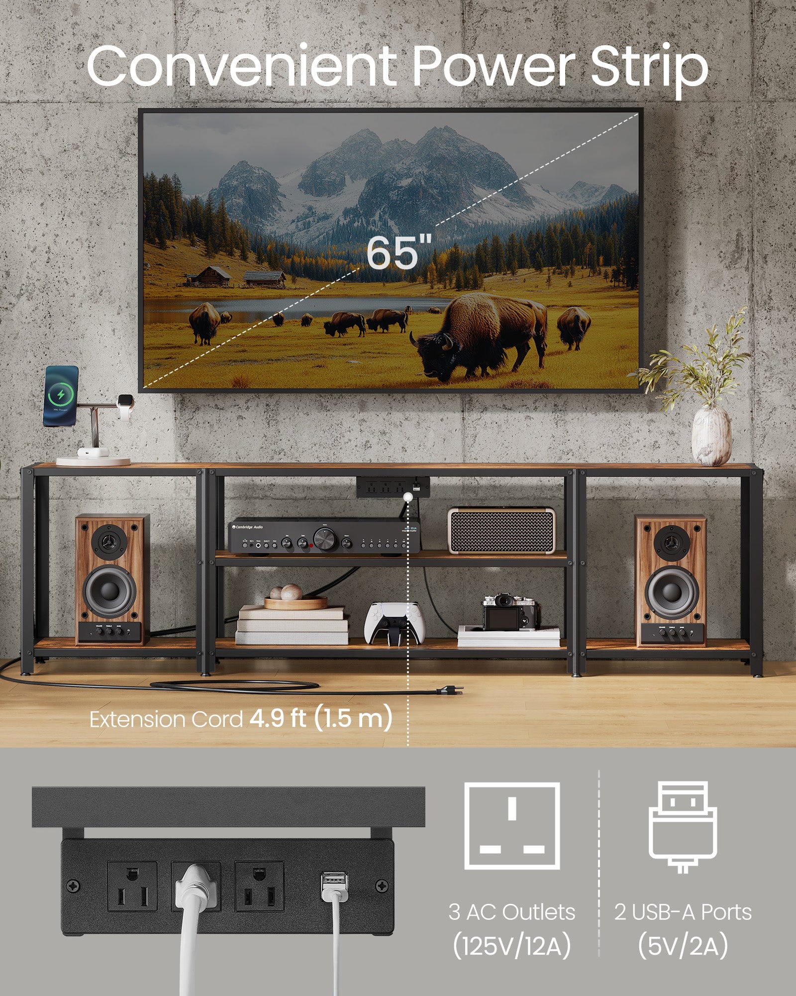 TV Stand With Power Outlets and LED Lights, for TVs up to 75 Inches, Entertainment Center With Open Storage Shelves, Console Table for Living Room, Rustic Brown and Ink Black
