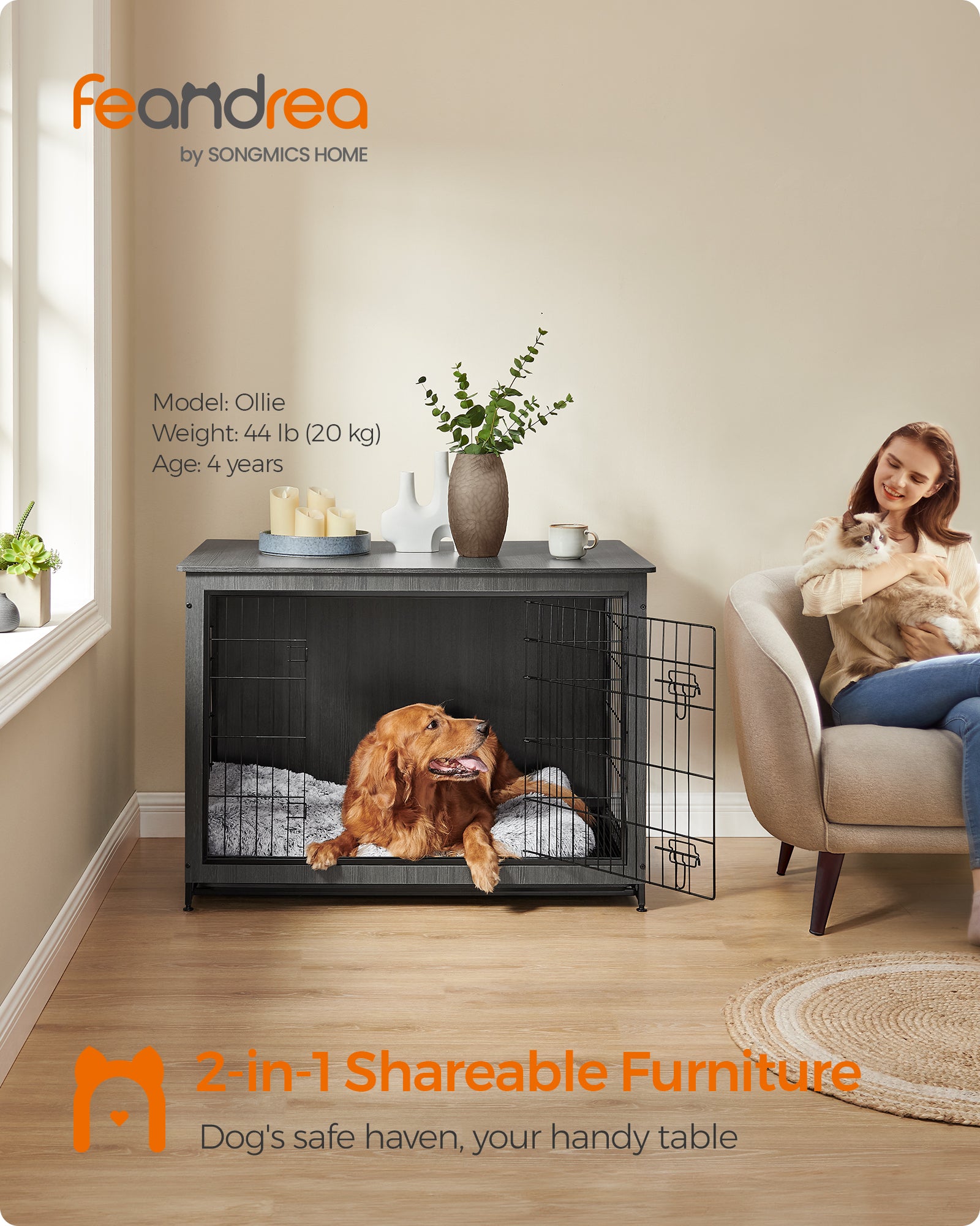 Wooden Dog Crate Furniture,Double-Doors Kennel for Dogs Indoor up to 80 lb, Removable Tray, End Table Dog Crate for Decoration 44.1"L x 29.5"W x 32.3"H, Ink Black